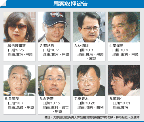 最早被收押的是卷入陳水扁家族洗錢疑案的力麒建設(shè)公司負(fù)責(zé)人郭銓慶,他在9月12日就因被臺(tái)北地檢署查出另涉世貿(mào)南港展覽館興建工程行賄標(biāo)案評(píng)選委員弊案,檢察官傳喚他到案,向臺(tái)北地方法院聲請(qǐng)羈押禁見獲準(zhǔn)。此后,除了機(jī)要費(fèi)案和洗錢密賬案外,又開始不斷開花。案外案不斷,以致在一個(gè)多月內(nèi)連續(xù)收押陳水扁任內(nèi)出納陳鎮(zhèn)慧、“總統(tǒng)夫人助理”蔡銘哲、前陳水扁辦公室主任林德訓(xùn)、泄密的前“調(diào)查局長(zhǎng)”葉盛茂、陳水扁妻子哥哥吳景茂、前“內(nèi)政部長(zhǎng)”余政憲等人。