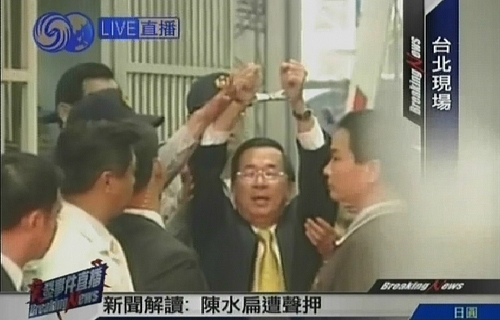 臺灣“今日新聞”報道說,陳水扁下午4時30分許步出特偵組準(zhǔn)備上車時,面對媒體高舉銬著手銬的雙手,喊完口號才上車,一副從容就義的模樣,顯然有備而來。