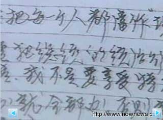 臺灣“今日新聞”報道,陳水扁在醫院3天洋洋灑灑寫了兩萬多字的萬言書,但是根據看守所規定,收容人不能帶筆等尖銳物品以免危險,所以根據了解他是用去掉筆管的筆芯來寫字,能這樣寫出2萬5千字,真是“毅力驚人”。