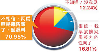 除此之外,臺灣《蘋果日報》還做了民意調查,結果顯示,70.95%的臺灣受訪民眾認為關于馬英九同性戀的說法是陳水扁餓昏了頭亂爆料,只有16.81的民眾表示相信此事。(韋博)