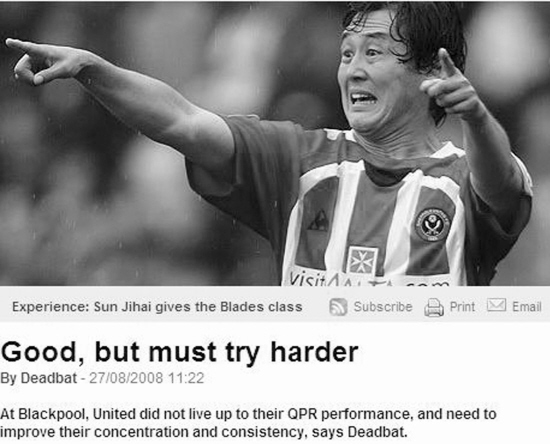 賽后英國專業(yè)足球網(wǎng)站《Rival》用“不錯,但要更加努力”的題目來形容這場比賽,畢竟主場平局對于謝菲聯(lián)隊(duì)來說顯得有些可惜,他們本來有機(jī)會取得勝利。不過這家網(wǎng)站仍然夸獎了幾名主場球員,中國球員孫繼海是其中之一,文章中如此評價:“在周六的比賽中,孫繼海、斯皮德和埃希奧古使得刀鋒軍團(tuán)看起來擁有更多的比賽經(jīng)驗(yàn),但是當(dāng)機(jī)會到來的時候,球隊(duì)并沒有很好的把握。”另外文章用一張孫繼海在場上的照片作為配圖,圖注上寫著:“孫繼海用經(jīng)驗(yàn)提升了謝菲聯(lián)隊(duì)的水平!(藍(lán)羔)