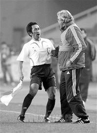 不僅如此,在國足第一個任意球射門出線之后,伊朗主裁以朝鮮隊金永俊提前移動為由,不但給金永俊出示了黃牌,還判任意球重罰。國足第二次也沒打進,此時主裁卻判再次重罰!這次的理由居然是杜震宇罰球時,主裁還沒鳴哨,為此,杜震宇又吃了黃牌,第三次罰球,曲波抽射偏出。如此一波三折的任意球,使得現(xiàn)場球迷也覺得搞笑,一位球迷說:“這個球不但吹得蹊蹺,而且罰了三次真是好!