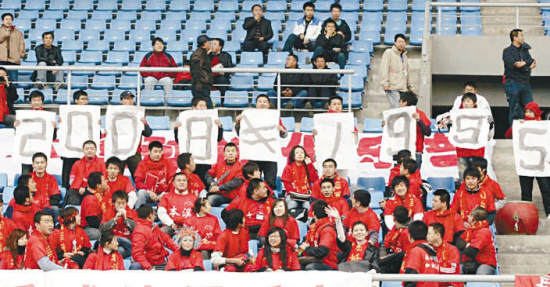 奧運后的中超并未如想象中凋敝,相反,在各個城市的看臺上展開了一場場“標語大賽”,每一輪聯賽都是一部眼花繚亂的標語大觀。球迷通過寫標語找到了新的樂趣,展示智慧與激情,抒發對中超的想法與感情。中國球迷不再只是喊喊口號唱唱歌,他們用新的娛樂方式引領中超走進“新娛樂時代”。