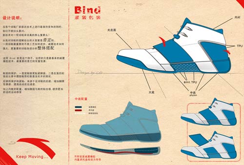 評(píng)委從外觀到用材,從設(shè)計(jì)創(chuàng)意到人體工程學(xué)等方方面面對(duì)參賽作品進(jìn)行考察,入選作品能夠最終落入大賽評(píng)委“法眼”的根本原因在于設(shè)計(jì)的獨(dú)特創(chuàng)意以及作品中所體現(xiàn)出的深厚的運(yùn)動(dòng)專業(yè)主義素養(yǎng)。比如戰(zhàn)袍作品“長(zhǎng)城”,以長(zhǎng)城作為CBA戰(zhàn)袍的設(shè)計(jì)源頭,言簡(jiǎn)意深;俠影的設(shè)計(jì)靈感分別來源于古代披風(fēng),唐裝,五線譜,天馬行空4種元素,極具英雄浪漫主義色彩;“ANTA--‘箭魚’籃球鞋”,取材于海洋生物——箭魚,鞋身整體造型以流線型為主,色彩明快,動(dòng)感十足;戰(zhàn)靴“Bind-緊緊包裹”,設(shè)計(jì)強(qiáng)調(diào)鞋面的包裹性,后腳踝的包裹性,和前掌的反應(yīng)速度,定位于速度反應(yīng)型后衛(wèi)選手,并且提供良好的保護(hù);“My Design My CBA”戰(zhàn)靴作品,設(shè)計(jì)中STAR主題貫穿鞋面,大面積的紅令人眼前一亮。而在后跟的承托上大面積的透明TPU,從后跟一直包裹到鞋身上,大大增強(qiáng)了鞋的穩(wěn)定性,保證在猛烈的切入動(dòng)作時(shí),雙腳不會(huì)產(chǎn)生側(cè)滑……