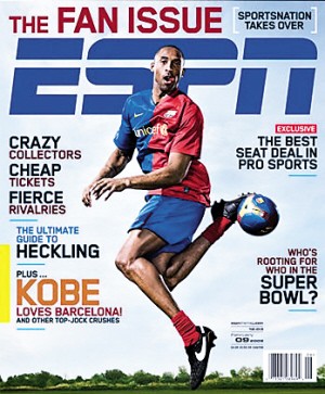 科比無疑是NBA的天王級巨星,同時他也是一名巴薩的狂熱支持者。日前某雜志記者采訪了科比,并且將一件印有“布萊恩特”的巴薩24號球衣送給了小飛俠。大喜過望的科比隨后又在ESPN雜志的邀請下,身穿巴薩球衣拍攝起了一組足球?qū)懻?如圖),在球場上大秀腳法。