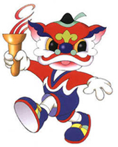 會徽:會徽中間豐滿,兩端漸細的曲線給人無限的延伸感,配合傾斜的線條,更顯奔騰飛躍之意。對比鮮明的紅、黃、藍三色,對視覺有強烈的沖擊力。造型灑脫地色勒出一個“9”,既直接傳達了九運會的信息,又宛如一位矯健、充滿活力、奮發向上的運動員,豪邁跨入新世紀。