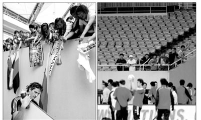 然而,這樣的熱烈氛圍隨著中國隊的到來消散殆盡。當(dāng)?shù)聡犕藞觥⒅袊犨M(jìn)場時,近2000名球迷竟然像潮水退潮一般,轉(zhuǎn)眼就迅速地隨德國隊一同離場。一名女球迷在撤退時向同伴高喊:“中國隊來了,快跑!”最終堅持留在體育場看中國隊訓(xùn)練的球迷,竟然只有屈指可數(shù)的8個人。(記者鄭小龍)