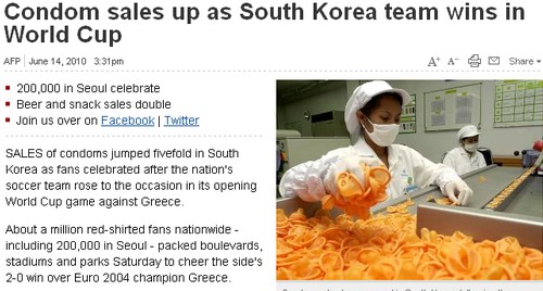 中新網6月15日電 在12日南非世界杯B組首輪小組賽中,韓國2比0擊敗希臘,而這場比賽的慶祝熱潮一直延續到了三天之后。據韓國媒體報道,韓國國內避孕套的銷量大漲了將近五倍。