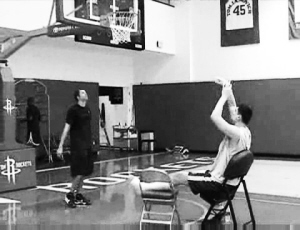 每天姚明都重復同樣的動作——坐車來到豐田中心,拄拐換乘擺渡車,拄拐來到訓練場,然后由甘寧幫他搬兩把椅子,一把給姚明坐著,一把給他放左腳。這兩把椅子每天要被擺在三個地方:正對籃下大約在罰球區的位置和兩個45度角。在每個位置上,姚明要進行100個投籃練習,每組投25個,分4組完成每個點的訓練量。