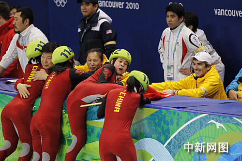 在裁判宣布韓國隊犯規(guī)后,一直等候著最終結果的中國姑娘忘情地撲向教練席。圖片清楚地顯示,興奮的王濛撲到教練李琰前面寬寬的防護墊上,她的右腿無意間高高抬起,冰刀刮到了跟在她身后的張會的下巴。王濛意識到自己闖了禍,馬上關切地回頭察看張會的傷情。四位姑娘舉著國旗慶祝勝利時,張會用手捂著她的下巴,漸漸地鮮血浸濕了她的手套。