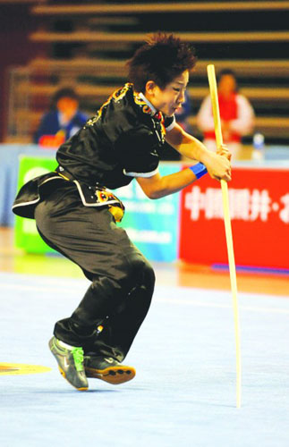 曹靜最后一個出場,當時形勢對她極為有利,只要拿到9.65分,冠軍就非她莫屬。動作質量和難度對曹靜來說沒有任何問題,關鍵是動作連接不能出現一點失誤。還是一身黑衫,最后一個出場的曹靜持刀往場地上一站,一個深呼吸,然后是一個威風的亮相,頓時全場一片叫好聲。隨后刀光一閃,曹靜快如閃電,疾如驟風,翻轉、騰挪,在陣陣喝彩聲中,曹靜舞出刀影重重。兩個馬步,一個劈叉,全都穩穩當當。最后,曹靜將刀拋出,然后飛身將刀穩穩地接在了手中。 9.83,裁判打出了全場最高分。加上棍術的得分,曹靜總分拿到19.64分,高出劉曉蕾0.19分。曹靜以巨大優勢獲得冠軍,劉曉蕾、馬嵐分獲亞軍和季軍。有意思的是,這三人也是本次比賽女子長拳的金銀銅得主。