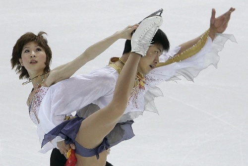 美國組合井上憐奈/巴爾德溫(Rena INOUE / John BALDWIN)是一對老將,今年女伴已經(jīng)31歲、男單已經(jīng)34歲;2007-08賽季的大獎賽美國站中,這對組合獲得了冠軍,十分不易。今天的比賽中發(fā)揮出了自己的水平,動作順利完成,技術分得到了31.86分、節(jié)目內(nèi)容得到了25.54分,短節(jié)目總分57.40分,暫列第三位。