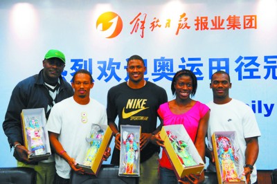 座談會(huì)上,還有北京奧運(yùn)會(huì)男子4×100米冠軍成員,牙買加隊(duì)的弗雷德和卡特,北京奧運(yùn)會(huì)女子400米金牌獲得者奧古魯格,雅典奧運(yùn)會(huì)和北京奧運(yùn)會(huì)兩屆女子三級(jí)跳冠軍姆邦哥。他們和奧利弗,都是第一批抵達(dá)上海參加黃金大獎(jiǎng)賽的運(yùn)動(dòng)員,此次受到解放日?qǐng)?bào)報(bào)業(yè)集團(tuán)和解放日?qǐng)?bào)領(lǐng)導(dǎo)的熱忱接待,并因收到了如穆桂英、孫悟空、趙云等京劇人偶,以及中國(guó)筷子等極具中國(guó)特色的禮物,而充滿驚喜。