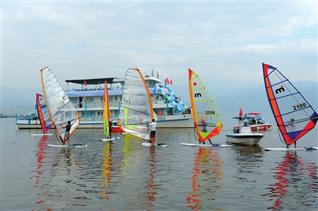 邛海水面上,八艘帆船來回穿梭。殷劍的小師弟、小師妹以特殊的方式,為自己的師姐助興。而在承辦婚禮的邛海賓館內,帆船的風帆成為最醒目的路標:一個箭頭標明了方向,一行小字寫著:“幸福的小船”。下午5點過,兩艘白色的小艇從不同方向慢慢駛向碼頭,新郎、新娘同時靠岸。率先上岸的新郎牽著新娘的手,慢慢走上游艇。雙雙放飛了象征愛情的信鴿。新郎、新娘在船頭完成了最深情的一吻。