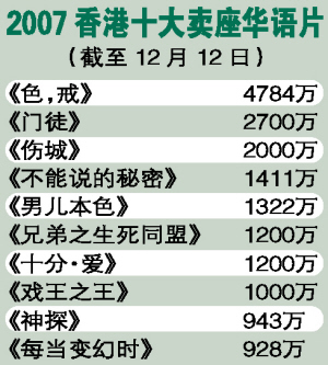 相對于外語片,華語片票房今年依然勢微。今年在香港上映的華語片共有47部,總票房達1.99億元,而《色,戒》以近4784萬票房一枝獨秀,撐起華語片半邊天!渡,戒》在香港至今仍未下畫,預計票房可突破5000萬元大關。其他華語片則數(shù)年初上映的《門徒》及《傷城》最賣座(2700萬及2000萬)。周杰倫首次執(zhí)導兼演出的電影《不能說的秘密》,則成為票房黑馬,在香港大賣1411萬元。