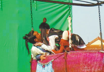 記者前往探班的一場戲,是該劇最后一幕:古天樂和大S經歷種種波折終于走到了一起,在古天樂用風箏和竹筐連成的“熱氣球”里度過浪漫時光。由于過于浪漫,大S演的俠女便起了“色心”,于是發生了強吻這一幕。