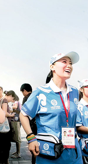 昨天,歌手譚晶來到鳥巢旁的志愿者服務站,履行她作為奧運志愿者的義務。