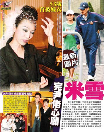 《家好月圓》的一幫演員聽聞米雪要嫁尹志強的消息后,紛紛提早道賀。“Jo鮑”夏雨祝兩人白頭到老,家好月圓。與米雪私交甚篤的馬海倫,除了連聲叫好外,還失口爆料:“據我所知,他們會低調搞。”