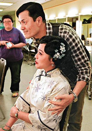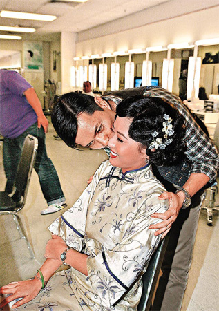 呂良偉在化妝間巧遇舊愛周海媚,突然親她面頰,周海媚露出尷尬神色。
