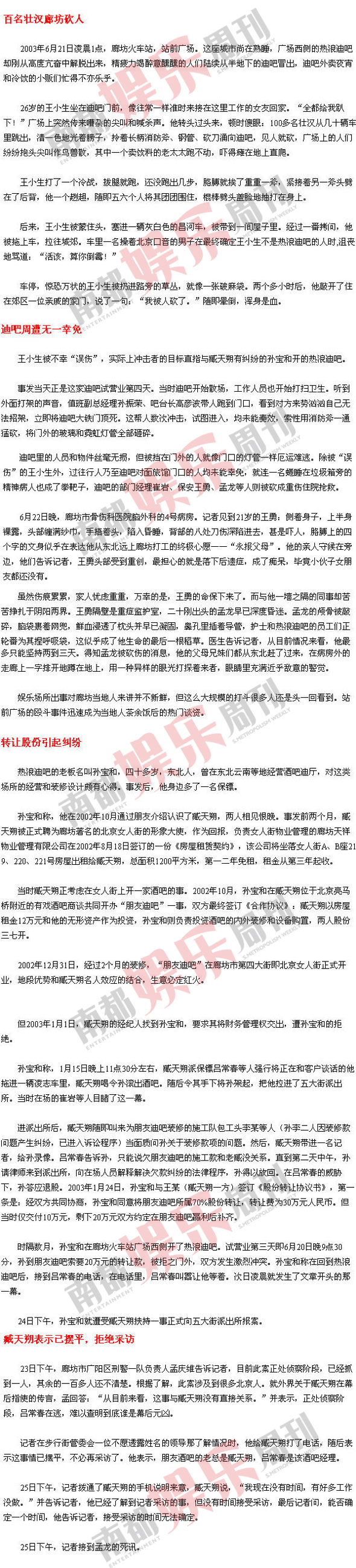 2003年的我正供職于京城某家在市場上享有盛譽(yù)的報社。那年夏天,孫寶和找到報社,拿了一大堆文字資料和現(xiàn)場照片,聲稱自己遭黑社會迫害,幕后主謀就是歌星臧天朔。當(dāng)時報社在異地采訪問題上一直相當(dāng)慎重,但沒想到很快就得到領(lǐng)導(dǎo)的充分許可。我和另一名攝影記者連夜趕往廊坊進(jìn)行了一周多的調(diào)查。令我深感意外的是,這么大動靜的毆斗居然沒有第二家媒體介入,更談不上披露問題,相關(guān)的細(xì)節(jié)和猜想也僅在群眾中間悄然流傳,我們成了惟一到現(xiàn)場采訪的記者。