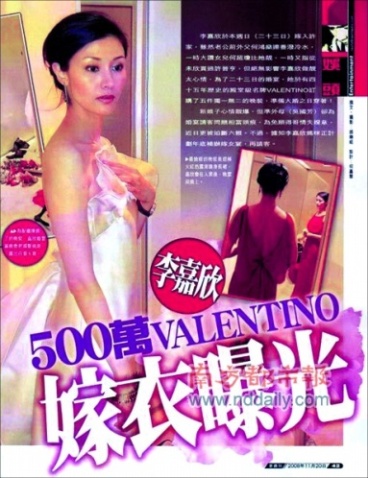 據《一周刊》報道,李嘉欣為了婚禮特意在Valentino訂做了5件晚裝,包括黑色、火紅、粉紅、杏色與金色,均屬獨一無二,總價值約500萬元!本周一,李嘉欣被周刊拍到在該品牌店內試裝,被曝光的兩件露背裝都很性感,尤其火紅色的禮服露出佳人的大半背部,十分搶眼。而穿上禮服的她還讓造型師一旁為其度裝設計發型。據悉,李嘉欣近日消瘦了些,因此要將晚裝縮改尺寸方可合身。