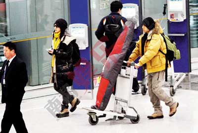 兩人情侶打扮,還帶著裝滑雪板的長袋子,裝備專業?磥恚矚g北海道的不僅僅是梁朝偉和劉嘉玲。