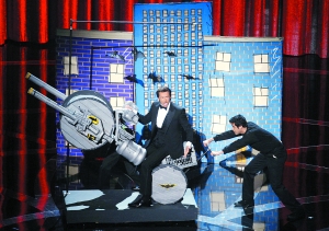 杰克曼在節目中場不忘一展曾是百老匯歌劇演員的基本功。只見他戴著高帽身穿燕尾服,和樂壇天后碧昂絲一起表演熱門音樂電影《歌舞青春》與《媽媽咪呀》,舞畢全場起立鼓掌,對他的精湛演出給予最高肯定。