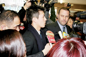 2:20開庭。陳冠希在律師陪同下出庭,由數(shù)名彪形大漢保護,現(xiàn)場沒有接受任何媒體采訪