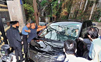阿嬌乘坐黑色保姆車到達楊受成大宅,車內窗簾全部拉上。