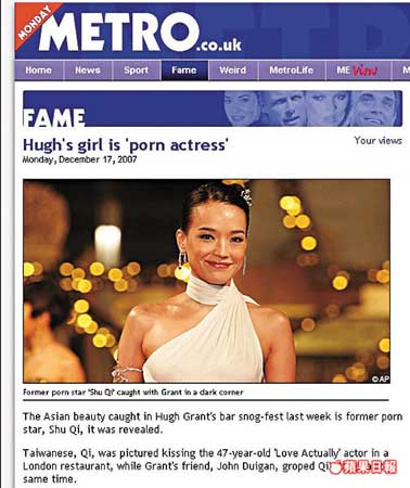 中新網12月18日電 上星期英國《鏡報》報道《諾丁山》(Notting Hill)男星休·格蘭特(Hugh Grant),與一名亞裔女子在倫敦一間日本餐廳當眾纏綿,其間他的一名男友人也對該女子上下其手。昨日《鏡報》指該名女子為舒淇,惟舒淇經理人得悉報道后作出嚴正否認,不排除采取法律行動。