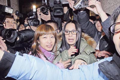 昨日,Twins兩女先后到佐敦的錄音室錄歌,阿Sa于下午5時(shí)45分先錄完離開(kāi),而阿嬌于晚上近8時(shí)抵達(dá),她剛下車(chē)即被30多名記者包圍。戴上黑框眼鏡,穿上軍褸,由三名助手陪同的阿嬌低著頭,全程保持微笑,并說(shuō)多謝大家關(guān)心。當(dāng)問(wèn)到有傳昨日疑似她與陳冠希的更激情的短片被上載互聯(lián)網(wǎng),阿嬌未有回答,便走入大廈。