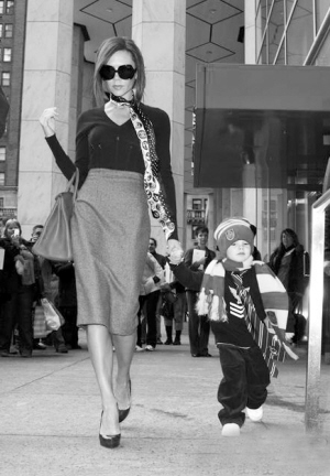 11日,美國(guó)紐約,辣妹維多利亞帶著兒子克魯茲上街購(gòu)物,卻險(xiǎn)被兒子搶去了風(fēng)頭。