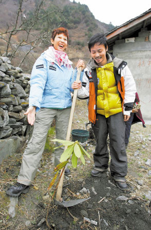昨日,新婚夫婦蔡少芬和張晉在四川雅安的慈善之旅進入第二天。與前天不同的是蔡少芬和張晉之間由刻意疏遠保持距離和回避新婚生活變得更加親密自然,十指相扣、相互攙扶、大秀廚藝,蔡少芬就像一個可愛的小女人不停地圍在張晉身邊打轉。昨天植樹節,兩人還在夾拉村的半山腰栽下了一棵象征愛情的“晉芬樹”。