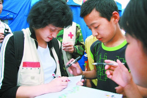 高敏昨天前往的這個小學,是從北川撤到綿陽的。她負責的這個班是一個五年級的班,有三十四個孩子。“我走進帳篷,看到孩子們就在這個不是很大的帳篷中挨挨擠擠地上課。條件非常艱苦,但每個孩子都非常認真。”高敏動情地說,“孩子們都不大認識我,我也不認識他們。所以我首先就安排了一個自我介紹的環節。”高敏的這個“自我介紹環節”非常有意思,就是一邊介紹自己的名字,一邊用一個形象的動作表示自己名字的意思。“我叫高敏,就是高度過敏。”說罷,高敏笑著撓撓自己身上的這里,撓撓自己身上的那里,然后讓每個孩子都如法炮制。“有的孩子名字中有一個‘強’字,他就挽起自己的袖子,露出小胳膊,鼓起肌肉;有的孩子名字當中有一個‘靜’字,她就笑著閉上眼睛,做出一個睡覺的樣子;有的孩子名字中有一個‘花’字,她就扮成一朵美麗的花的樣子。”高敏動情地說,“當每個孩子說完一遍之后,我真的感覺到他們在為他們自己的名字感到驕傲。”