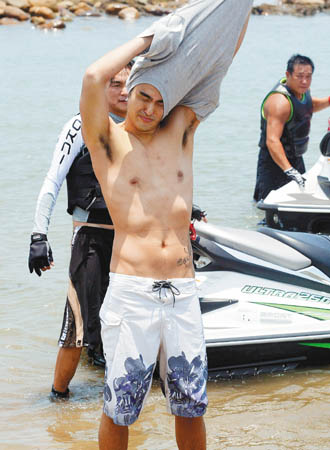 但攝影器材再厲害也沒用,因為阮經天被安排在離岸至少100公尺以上的海域,除非狗仔派出水底攝影隊。阮經天下水前只略略小露股溝,跳下水后脫掉海灘褲,游了幾下又穿回去,很快回到岸上,他笑說:“剛很怕有小魚小蝦來啄耶。”