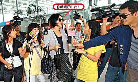帶備多箱酒送給嘉玲的李亞鵬,與王菲及靖童于昨晨10時半左右出現曼谷機場,隨即引起大混亂,10多名記者及3間電視臺攝制隊將王菲重重包圍,又將麥克風遞向王菲她講兩句,她卻說:“我趕時間了!”