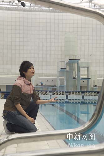 結束了專家訪談的重要環節之后,李宇春終于可以放松一下,與這個大水泡組成的新奇場館好好地親密接觸。她一會兒在泳池邊細細觀察水下的攝影裝置,一會兒跑到觀眾席體驗觀賽的新鮮感覺,此時的她顯現出好奇、天真的本色一面!八⒎健睍r尚的設計、舒適的環境令李宇春流連忘返,直呼這個場館“太棒了”。