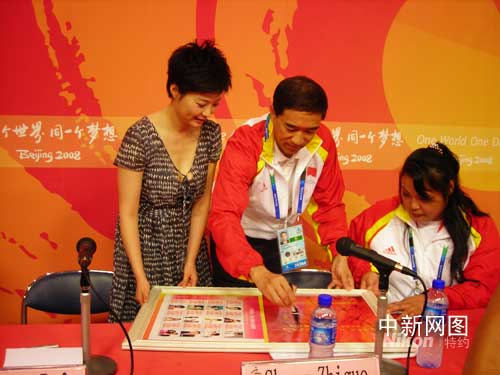 簽名紀(jì)念:袁立(左一)中國代表團(tuán)副團(tuán)長盛世國(左二)殘奧盲人柔道冠軍袁艷萍。
