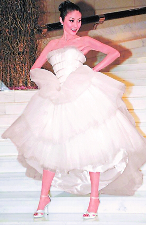 奚仲文說,“kelly想有一套比較夸張的婚紗給記者拍照,碰巧Lusan Mandongus工場肯人手趕制一件,構思是配合洲際酒店的長云石樓梯。頭紗從英國訂過來,長15米左右;婚紗布料則從法國運過來,從最初的12米改成6米多。最初鋪了上千朵牡丹,但鐘珍說999朵好意頭,這衫足足做了一個多月。”