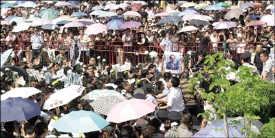 12點,羅京夫人劉繼紅淚流滿面、悲痛欲絕,在兒子的攙扶下走出靈堂。康輝、賀紅梅等央視名嘴也不忍與好友永別,掩面哭泣。記者 趙楠楠