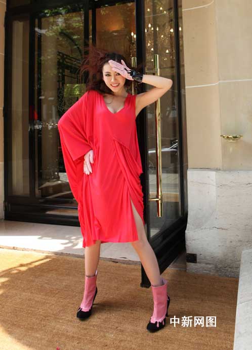 鞏新亮在法國巴黎雅典娜廣場酒店門前拍攝的時裝大片,一身紅衣,玲瓏曲線身材凹凸有致,令人著迷。