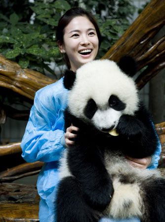 成都大熊貓基地方面表示:“去年因四川大地震,熊貓的另一個(gè)棲息地——臥龍基地被毀,因此正在募集重建基金,而這次宋慧喬擔(dān)任愛心大使,所以希望能夠得到中國和亞洲其他國家的幫助。”