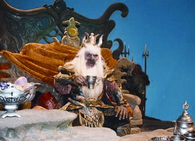 當(dāng)記者來(lái)到攝影棚時(shí),正在拍攝的場(chǎng)景是牛魔王殿前獨(dú)酌的一場(chǎng)戲,身為主角的唐僧師徒四人則不見(jiàn)蹤影,只見(jiàn)魁梧威嚴(yán)、黑臉白須的“牛魔王”端坐在寶座上,數(shù)十名青面獠牙的“小妖”分列兩旁。(周文韜)