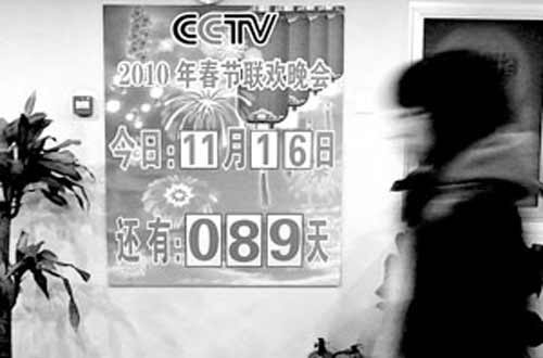 這個由紅色燈籠、黃紅相見的煙花裝扮的倒計時牌,格外喜慶。昨天,倒計時牌上顯示“CCTV2010年春節聯歡晚會今日:11月16日 還有:089天”。