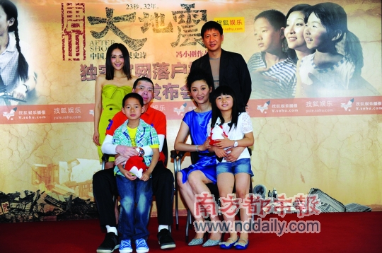 昨日,即將于7月22日在內地、香港、臺灣同步上映的《唐山大地震》在搜狐網開通了電影官方網站,導演馮小剛攜主演徐帆、張國強等出席發布會與網友一同分享了他們關于30年前的記憶,并首度向外界公布了影片中“張國強、徐帆一家”的全家福照片。而在隨后的采訪中,馮小剛則否認了徐帆因為是自己妻子才得以出演《大地震》的傳聞,“徐帆的水平在那兒擺著,她撐起了這部電影的魂!蓖瑫r,對于影片的票房,馮小剛再次放出豪言,“誰不服,就和《大地震》同天上映!”