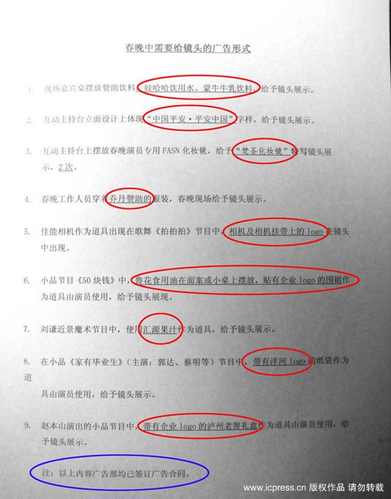 近日網絡上曝光的一張題為“春晚中需要給鏡頭的廣告形式”清單上共列出九條廣告植入條目,包括飲用水、化妝鏡、服飾、相機、酒等,外界十分關注的劉謙魔術、趙本山小品《捐助》、郭達蔡明的小品都有涉及。