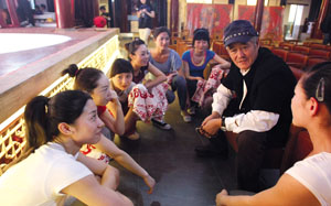 趙本山在二樓一直觀察排練,表情嚴肅。下樓后徑直走到臺前,把8位女孩叫到身邊。“多大了?”本山大叔態度和藹,先和她們嘮起了家常。