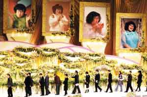追思會會場耗資百萬布置得金碧輝煌,上方是四個方向的轉播屏幕,舞臺上用金色綢布與香檳玫瑰組成,懸掛著肥姐5張生前各個時期的巨幅照片。舞臺前面寫滿悼詞的牌子林立,悼念排后是一架三角鋼琴,以及寫有“肥姐,我們永遠想念您”字樣的花圈。而臺下嘉賓席的正中央,也有數列座位擺上了整齊的花圈,足足延綿十幾米長。