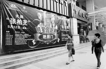 記者核實:昨天下午2點多,記者在江濱路新時代影院樓下的千度酒吧門口看到了吳先生說的廣告。在千度酒吧門口右側的一副海報上,寫著“大陸張柏芝”、“大陸陳冠希”以及兩人的真名和相關簡介,中間顯要位置是兩人照片和“明星零距離”、“艷照門”字樣。許多路人從海報前經過都不禁瞄上一眼。