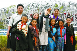 由國家廣電總局主辦的一場以奧運(yùn)為主題的慈善晚會(huì)正在緊張地籌備之中,其中邀請了六位來自四川藏區(qū)希望小學(xué)的同學(xué)參加。范冰冰贊助了幾位藏族小朋友的往返機(jī)票并抽空陪同他們一起參觀奧運(yùn)場館。圖為范冰冰帶領(lǐng)大家參觀奧運(yùn)會(huì)的主場館“鳥巢”。記者 楊林